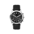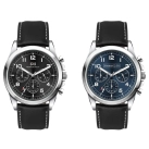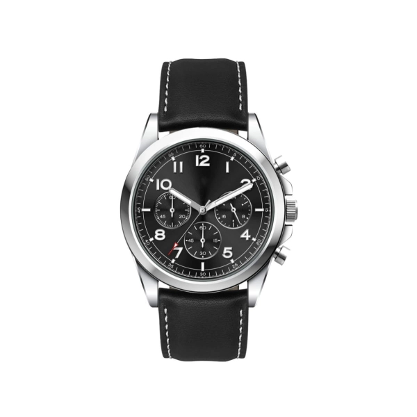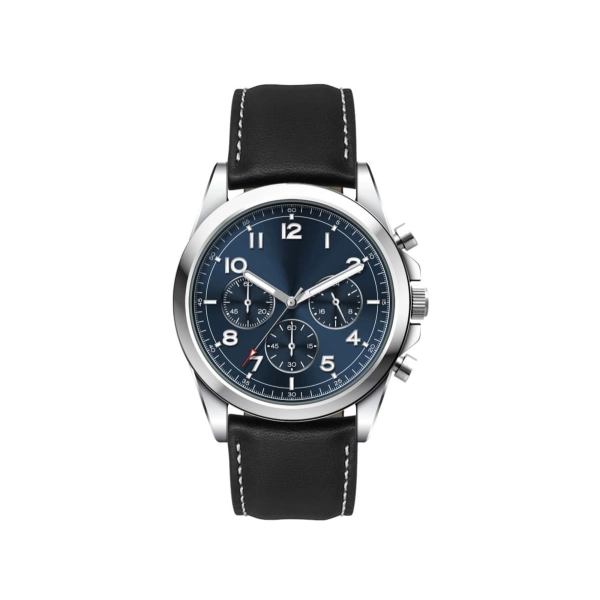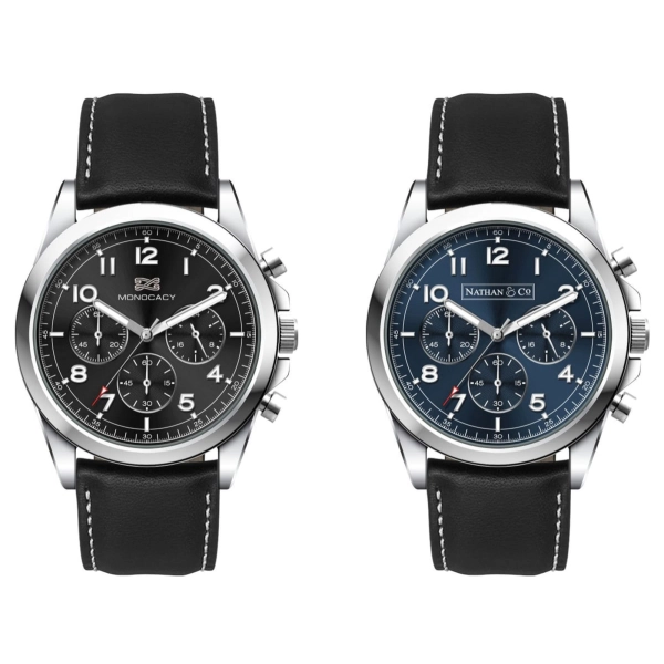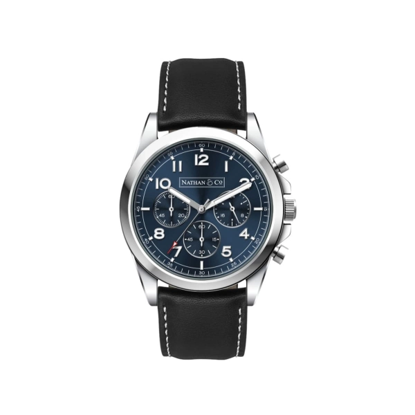 This quality chrono unisex watch features an Ionic steel plated alloy case, padded black natural leather strap with white stitching, Seiko VD54 chrono movement and is water resistant to 3 atm’s. This watch is avaiable with the choice of black or blue sunray dials.