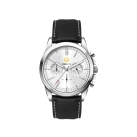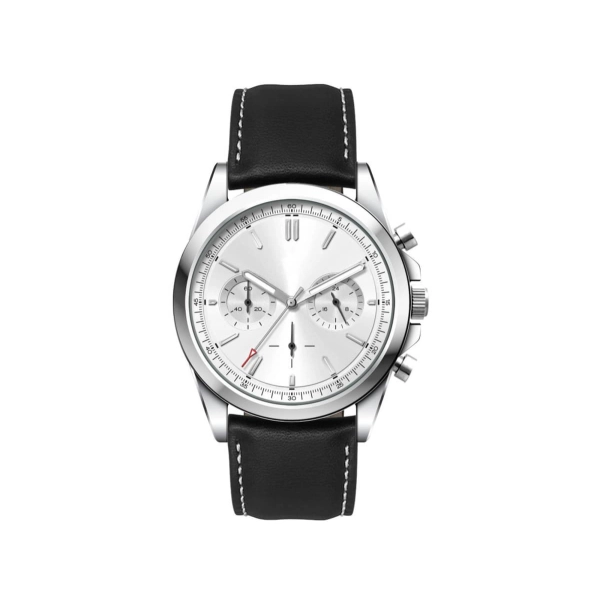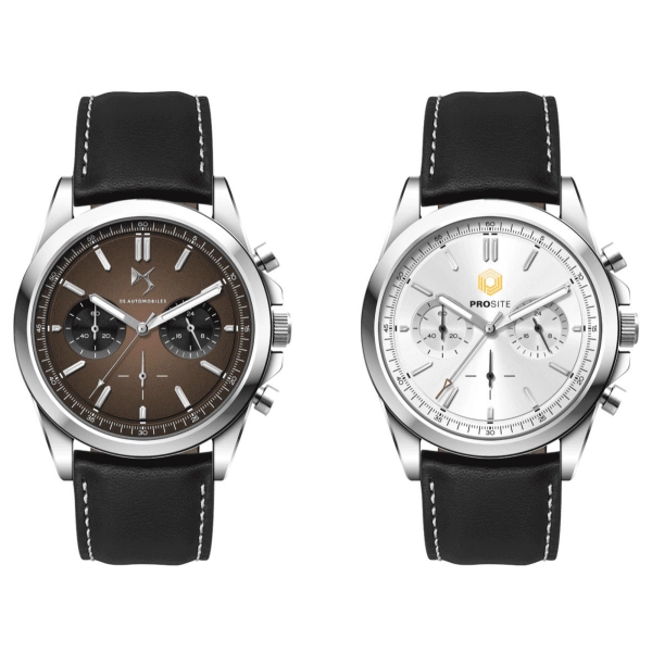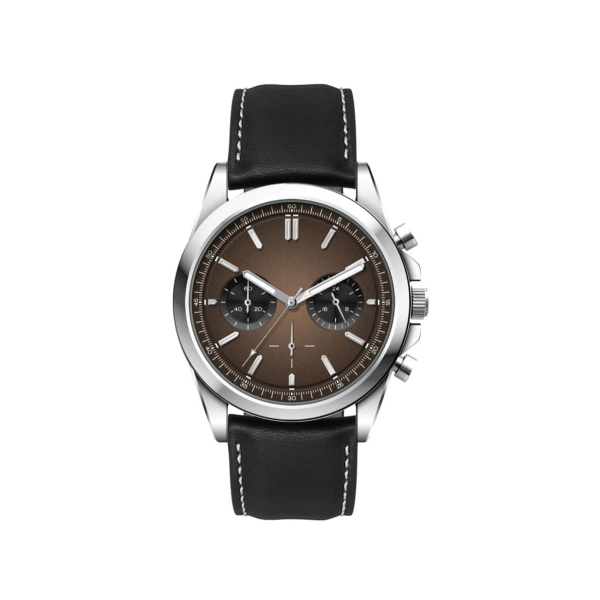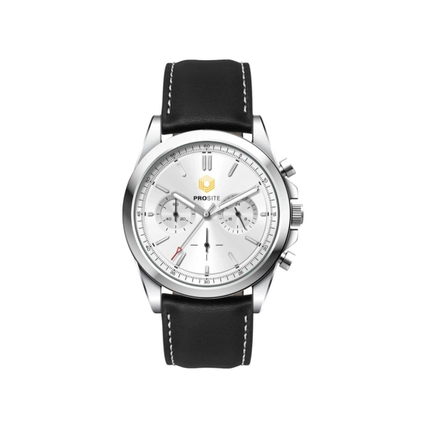 This quality chrono unisex watch features an Ionic steel plated alloy case, padded black natural leather strap with white stitching, Seiko VD54 chrono movement and is water resistant to 3 atm’s. This watch is avaiable with the choice of silver or brown sunray dials.