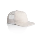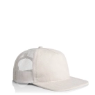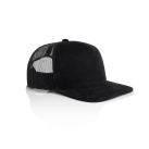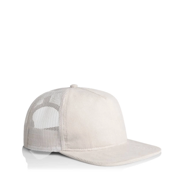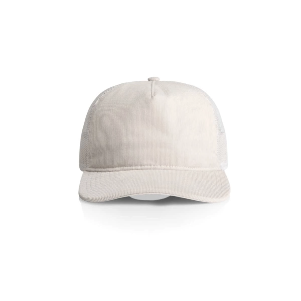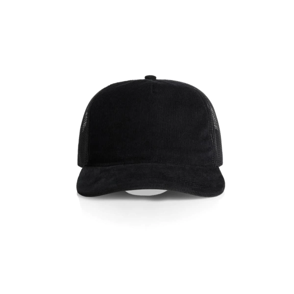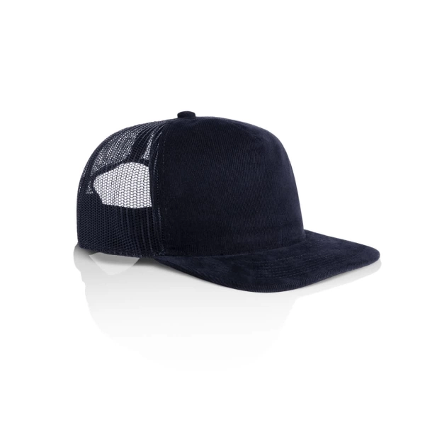 AS Colour Class Cord Trucker: Mid-weight, mid-profile cap with a 100% cotton 16-wale partridge cord front and peak, paired with a breathable 100% recycled polyester mesh back. Features include a five-panel design, flat peak mesh back, plastic snapback, and tear-out AS Colour label for comfort and style.