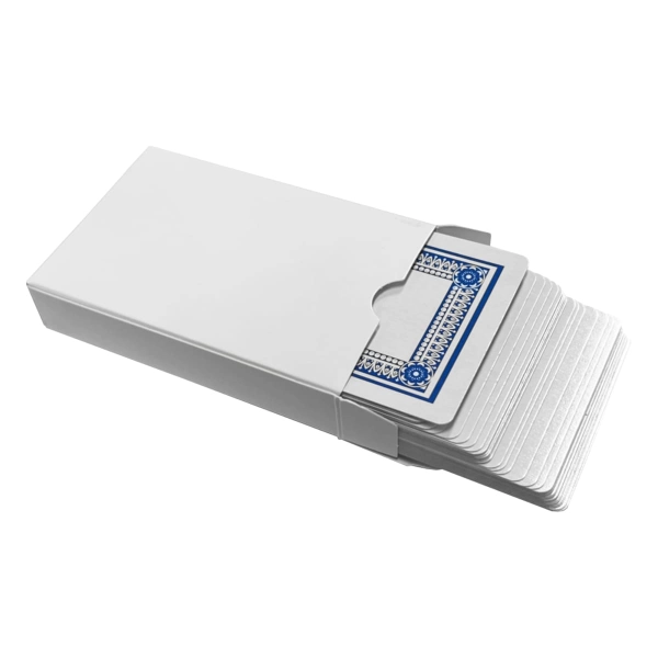 Set of 55 playing cards with 1 spare card in a white cardboard box with branding options on the back of white cards and also on the white cardboard box.