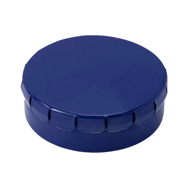 Food grade metal round popper mint tin filled with sugar free breath freshener mints(approximately 100pcs) and full ingredient and nutritional information is printed on the back of the tin. Sealed with plastic wrapping on the side.