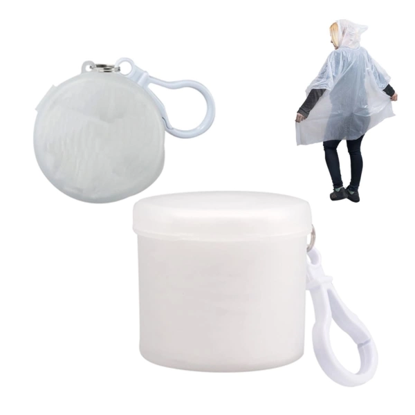 Handy translucent white reusable poncho with a hood folds into a frosted white plastic canister which has a flip open lid and a white carabiner clip attached one size fits all.