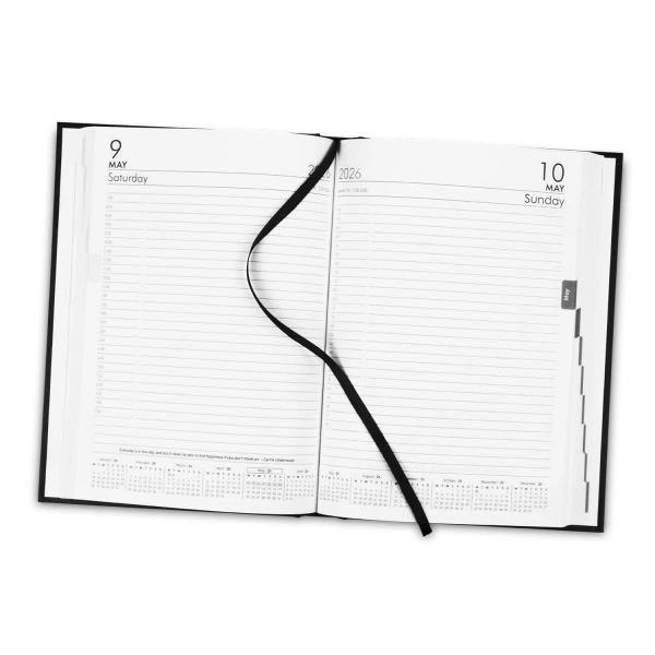 * A5 daily diary with durable black textured hard cover and convenient ribbon marker