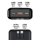 The Collins Eco power bank is essential for those continually running out of juice! Offering integrated Lightning and Type-C cable outputs and Quick Charge USB-A and Type-C output ports, the Collins Eco allows charging 2 devices simultaneously. With its state-of-the-art Quick Charge features, this 20,000 mAh, A-Grade lithium-polymer battery is housed in a classic-styled recycled ABS case. Complete with an easy-to-read digital display showing the remaining power and protection to stabilise the output voltage and prevent overcharging or short circuits. The packing includes a Type-C charge cable and a user manual. Material: 28% Recycled ABS (RCS).