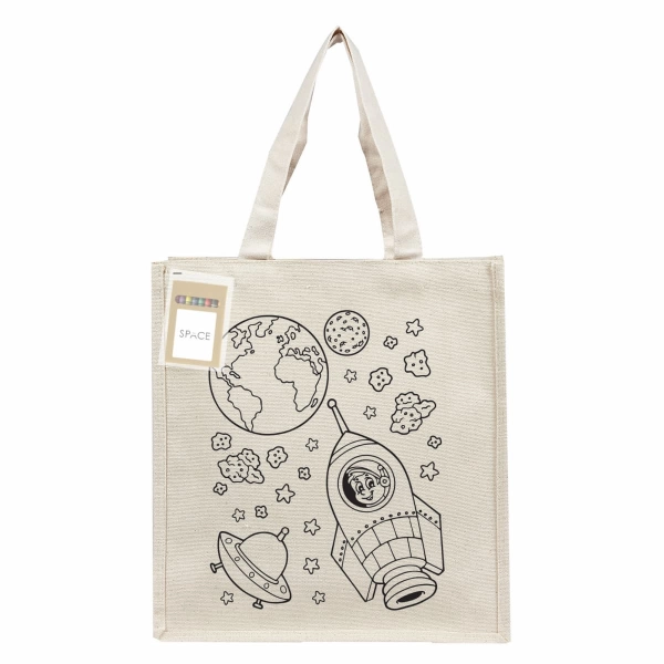Colour your own custom design character cotton tote bag this bag makes a fun way for kids to use their creativity to colour and decorate the bags. It keeps kids entertained for hours and away from electronic devices. The bag is made of 12oz 100% cotton canvas with inside PVC laminated which makes the material thicker and harder it comes with 8 assorted non toxic coloured wax crayons packed in a recycled cardboard box which will be packed in a small plastic bag stapled on cotton bag. Crayon Colours Pink Red Orange Yellow Green Blue Purple and Black.
