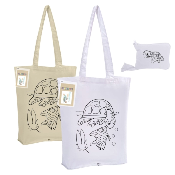 Colour your own custom design character foldable cotton tote bag this bag makes a fun way for kids to use their creativity to colour and decorate the bags. It keeps kids entertained for hours and away from electronic devices. The bag is made of 170gsm echo friendly 100% cotton fabric with bottom gusset and can be folded and zipped into a small wallet size it comes with 8 assorted non toxic coloured wax crayons packed in a recycled cardboard box which will be packed in a small plastic bag stapled on cotton bag. Crayon Colours Pink Red Orange Yellow Green Blue Purple and Black.