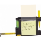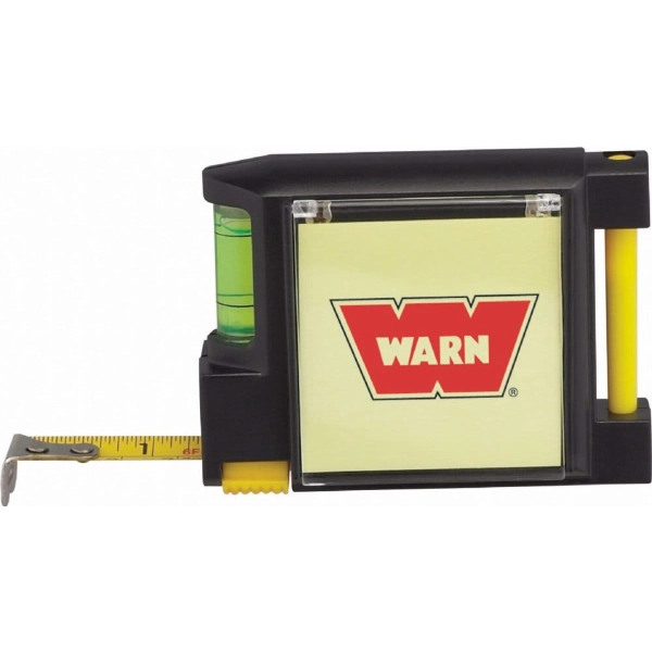 10-foot retractable, locking tape measure. Built-in level. Includes 1-3/4 inch x 1-3/4 inch yellow sticky memo pad, mini pen and metal belt clip. Locking button on bottom of item keeps tape in place. Clear flip-top cover protects memo pad.