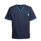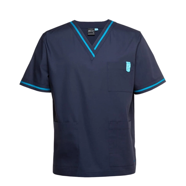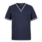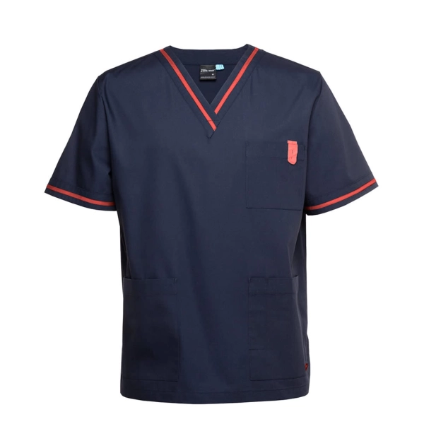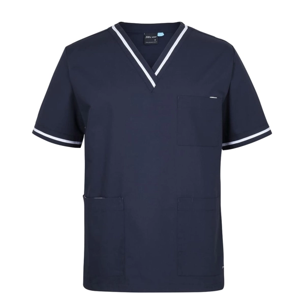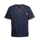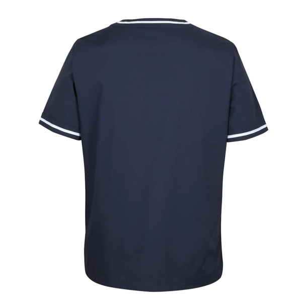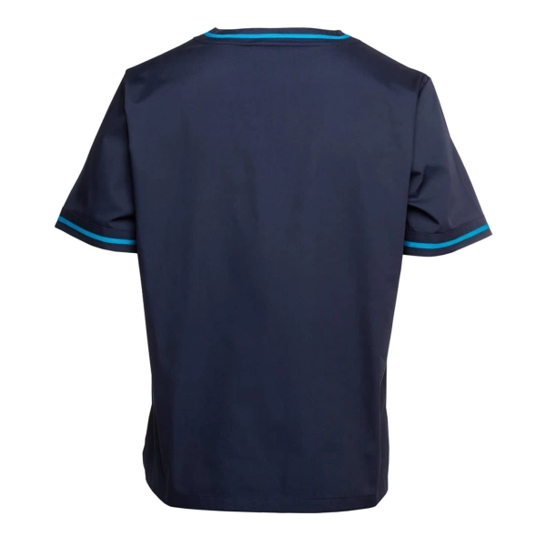 Classic fit | 65% polyester 35% cotton 180gsm | V-neck top, set in sleeves, side vents, size identify colour loop sewn next to main label | Contrast tape on collar and sleeve hem | Left hand chest pocket with loop inside | Two lower pockets, left hand pocket with pen insert | 3XS-2XS only available in Navy/White