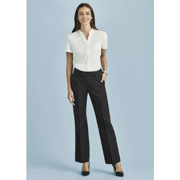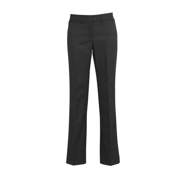 Features: A comfortable everyday pant, mid-rise waist with a waistband designed to sit just below the navel. Straight leg, front horizontal pockets with one pocket on the rear.