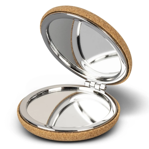 Compact mirror with a hinged cover and natural cork exterior. It features two mirrors one normal, and one two times magnification. When cork is harvested only the outer bark is removed from the tree. This allows the tree to continue growing and replenishing the bark. It also has the benefit of a comfortable soft-touch texture while being very durable.