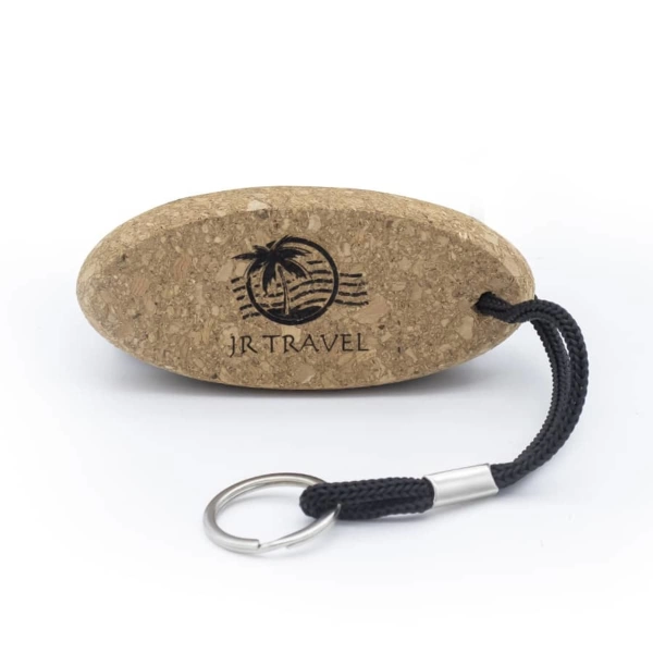 Keep your brand in sight with the floating cork keychain—lightweight, practical, and perfect for everyday use. The natural cork ellipse is designed to stay afloat, making it a great choice for boats, beach trips, or outdoor adventures. A black rope and silver chain add a secure touch, ensuring your keys or bag tag stays put. Customise it with laser engraving (appearing black) or a pad print of up to three colours for a standout promotional piece. Due to the natural material, slight variations in colour may occur.
