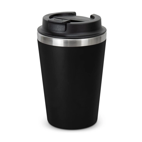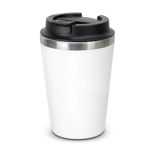Sleek 350ml double wall coffee cup manufactured from recycled polypropylene and stainless steel. Features a flip closure lid that folds all the way back for easy drinking. Available in a range of vibrant colours to match your brand.