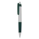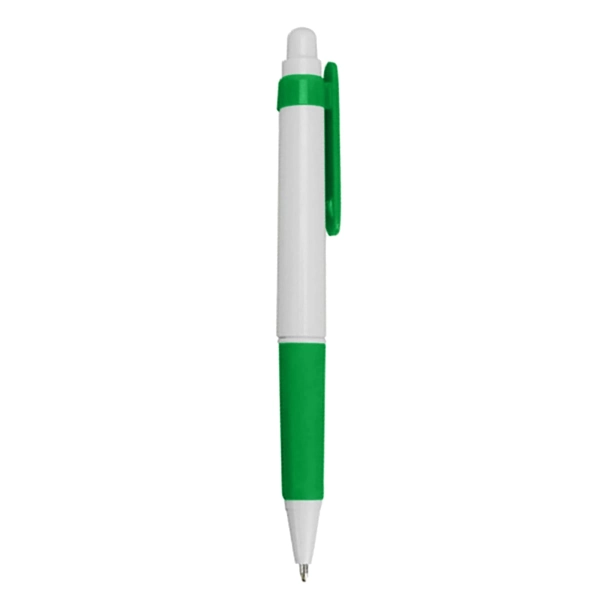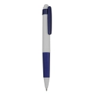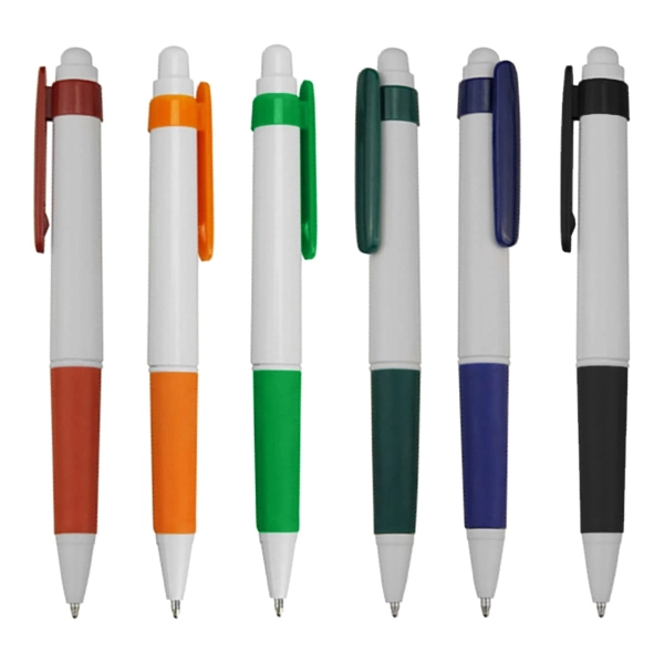 Retractable action plastic pen with solid white barrel coloured clip and rubber grip high quality German manufactured black ink refill and tungsten carbide ball which brings you the better writing quality 1200 meters writing distance.