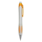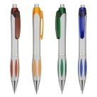 A silver plastic pen with transparent coloured clip a colour matching petal on the clip retractable action with shiny silver chrome fittings high quality German manufactured black ink refill 1800 meters writing distance tungsten carbide ball provides you with quality writing.