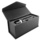 Danube aluminium torch. Twist action metal ring with three adjustable beam focus settings. Requires AAA batteries which are not included, otherwise this item can use the rechargeable 4800mAh battery which is included with power cord for recharging. Packed in black gift box which can also be printed.
