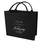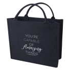 The Page recycled tote bag is the perfect fit to hold daily items and to bring on a variety of trips, from library to grocery store. With short but sturdy handles, this bag is comfortable to carry around for a long time.