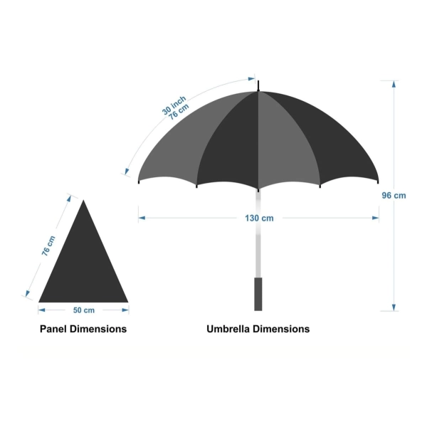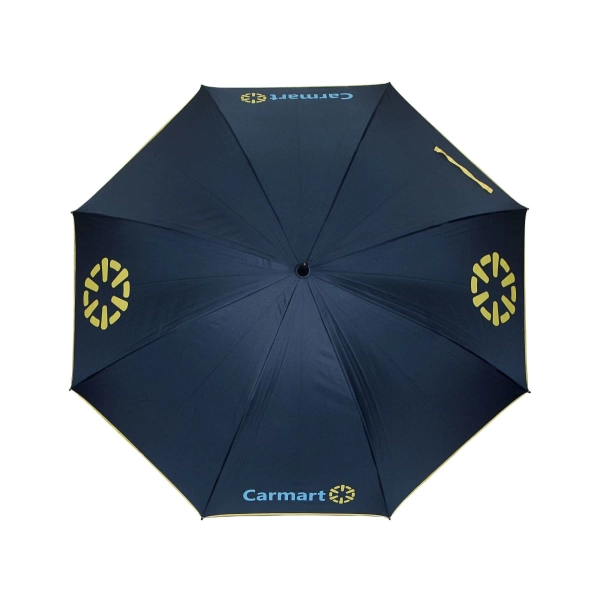 Designa Screen Printed Promo Golf Umbrella is far more than just an umbrella, it’s a moving billboard designed to elevate your brand above the rest. Your corporate logo or chosen graphic is screen printed onto 1, 4 or 8 umbrella panels as well as onto the umbrella pouch, guaranteeing maximum brand exposure. In order to further customise this umbrella we can PMS match the canopy trim, velcro closure strap and the pouch trim. This superior quality 8-Panel full-size Golf Umbrella (30″/76cm) features a seamless automatic open function, allowing for single handed operation in unexpected downpours. The sturdy fiberglass shaft and ribs provide unwavering strength, while the ‘Comfort Grip’ handle ensures no-slip operation in wet conditions.