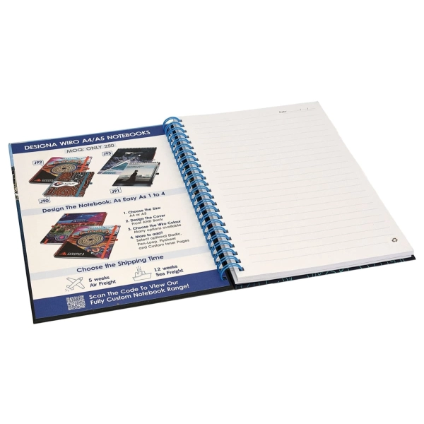 The Designa A5 Wiro Side Bound Notebook features a sturdy Wiro metal binding, allowing the notebook to open completely flat for ease of use. You can select the Wiro colour from our standard range of 8 colours and match the optional elastic closure and pen loop to either the Wiro colour or the cover design. Wiro is also sometimes known as wire or spiral binding.