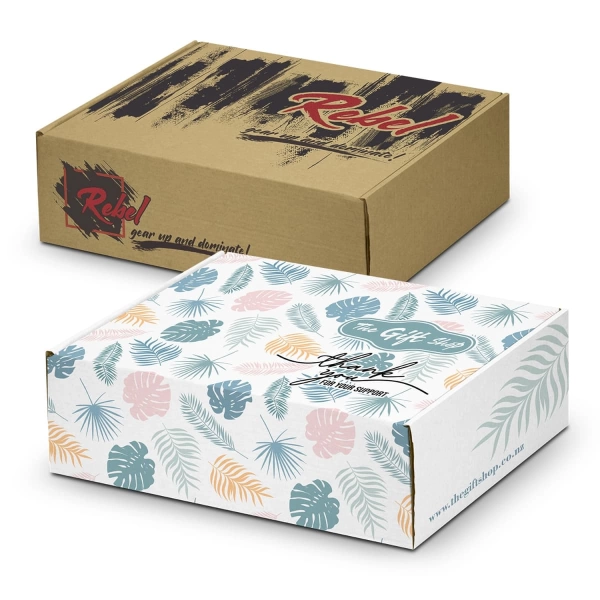 Professional custom gift box made from durable 3mm e-flute corrugated cardboard to provide reliable protection during transit. This extra-large box is perfect for gifting and building strong brand recognition. Featuring a convenient hinged lid, selected panels of the box can be customised with CMYK digital print. It is supplied flat-packed for easy postage and storage, and its self-locking design ensures hassle-free assembly. The assembled internal dimensions are 502mm x 295mm x 150mm (LxWxH).