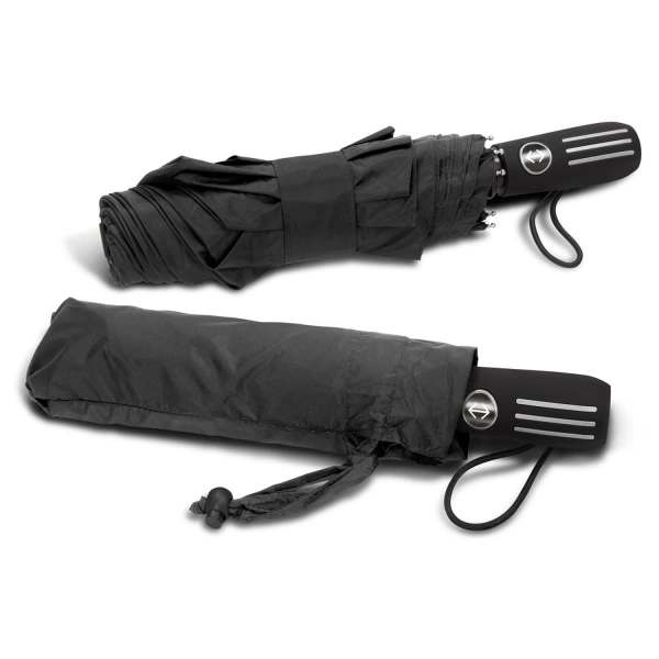 The tri-folding Director Umbrella sports a generous canopy while folding down to a compact 33cm. It has an eight-panel vented pongee canopy with 57cm fibreglass ribs and a steel shaft. Other features include automatic opening and closing, a woven carry handle and a matching pongee drawstring sleeve.