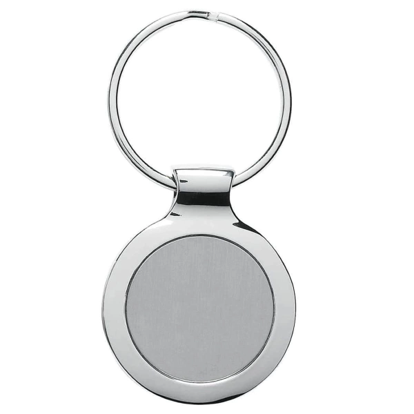 This elegant design keyring is one of most popular keyrings and can be used for almost every single promotional events. It features a simple design a round brush finishing panel in middle framed by chromed shiny base which highlights the corporate logo and information made of zinc alloy metal.