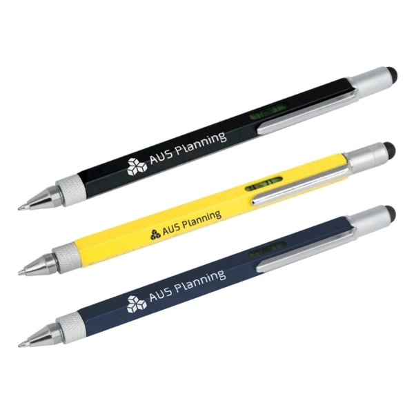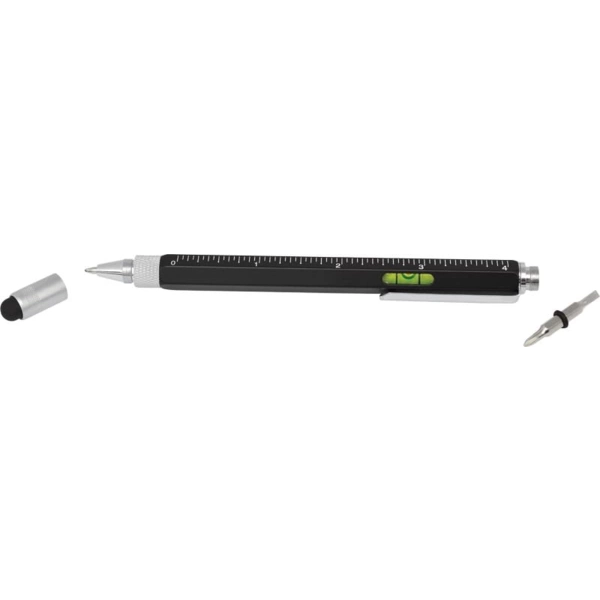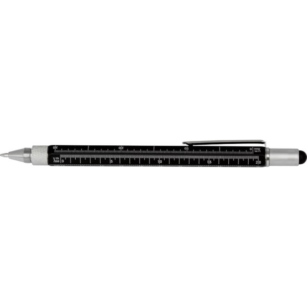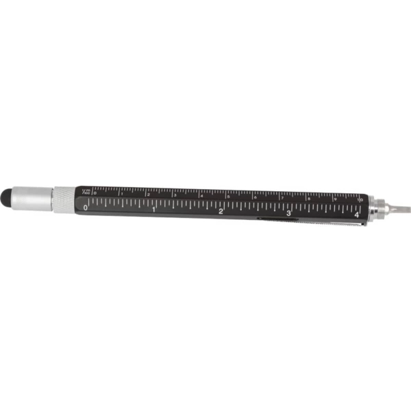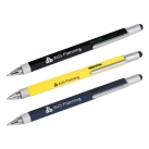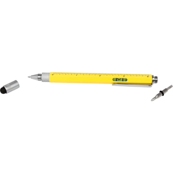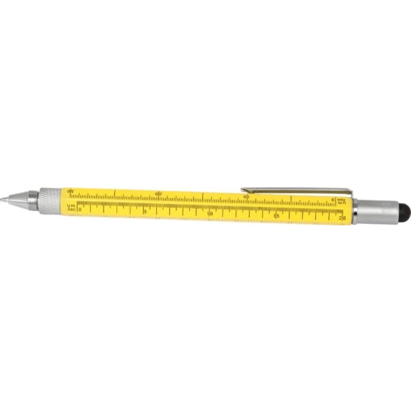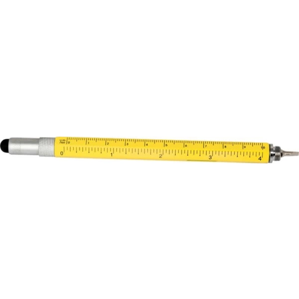 This top of the range metal 9-in-1 pocket tool incorporates a pen, stylus, 4 rulers, spirit level, phillips and flat edge screwdriver all in a useful stylus pen. Available in black, blue or yellow, all with silver trim.