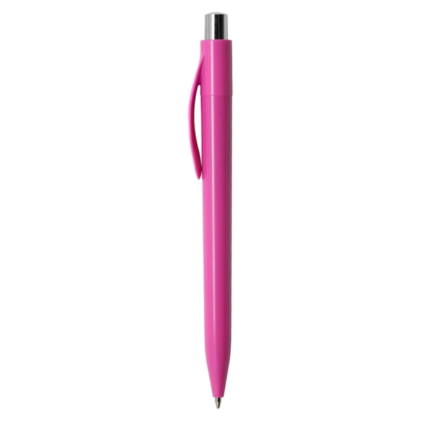 Retractable plastic pen with silver chrome push button simple design with large colour selection. It has high quality German manufactured black ink refill 1800 meters writing distance tungsten carbide ball provides you with quality writing.
