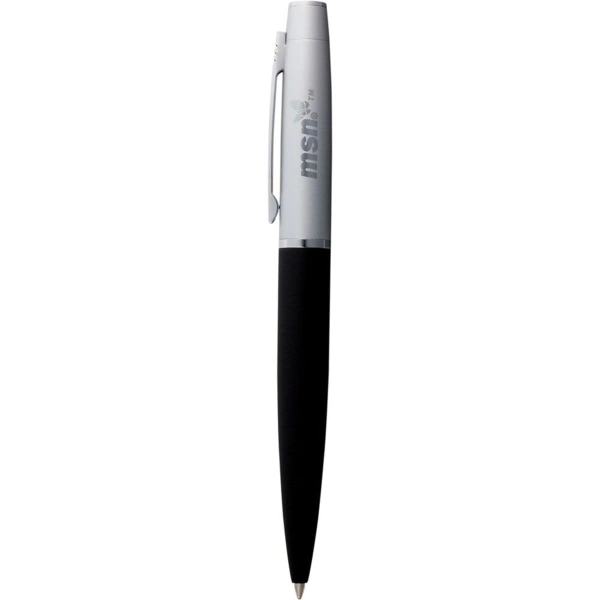 Sleek design features spray rubber coated bottom barrel and high gloss upper barrel accenting with chrome details. Pen includes premium black ink cartridge.