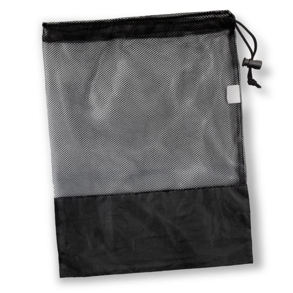 Drawstring bag which is manufactured from Mesh and 190T Polyester. It features an insert at the bottom and a drawstring at the top to keep belongings secure inside it. Because it uses mesh, the bag is breathable as well as being the perfect size for storage, to put your laundry in whilst travelling or as a convenient shoe bag when your out and about.
