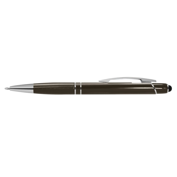 Retractable aluminium ballpoint pen with shiny anodised coloured barrels and a matte anodised silver barrel, all of with shiny chrome trim. It has a stylus and a black refill with 800 metres of German manufactured Dokumental ink. Dream can be presented in an optional pen sleeve.