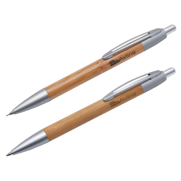 At long last an environmentally friendly pen and pencil set. Both pen and pencil are made from natural bamboo and feature satin chrome accents. Supplied in a natural coloured gift box.