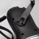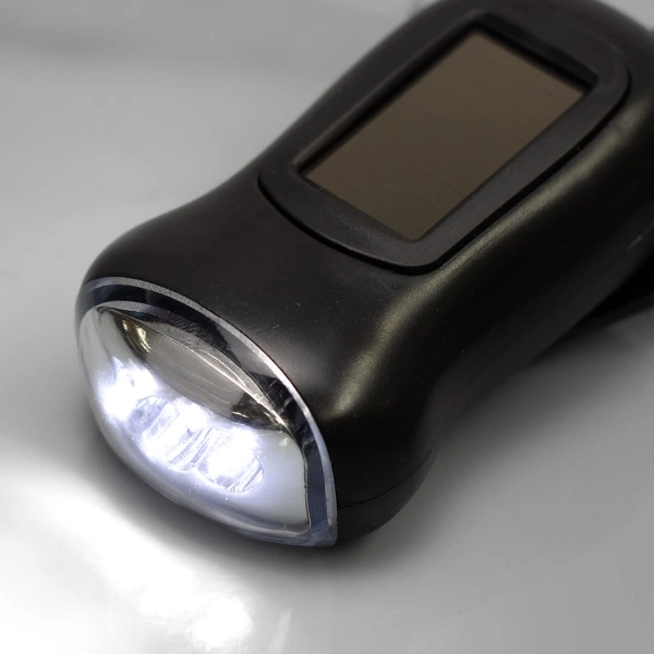 Handy rechargeable matte black torch with silver trim. Made from ABS plastic, Dynamo can be recharged using the crank mechanism or via the solar panel.