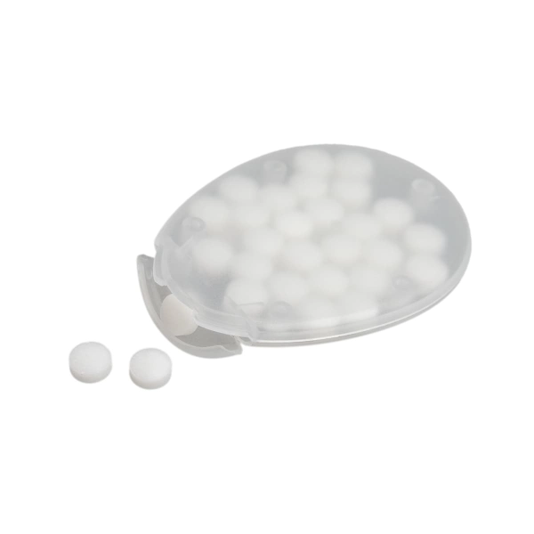 Oval mint dispenser with snap lock opening. Contains approximately 30 sugar free mints. Finished weight 14 grams.