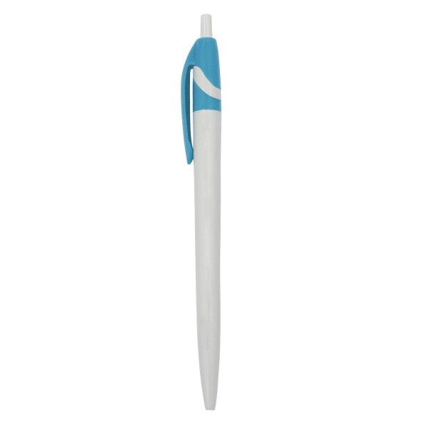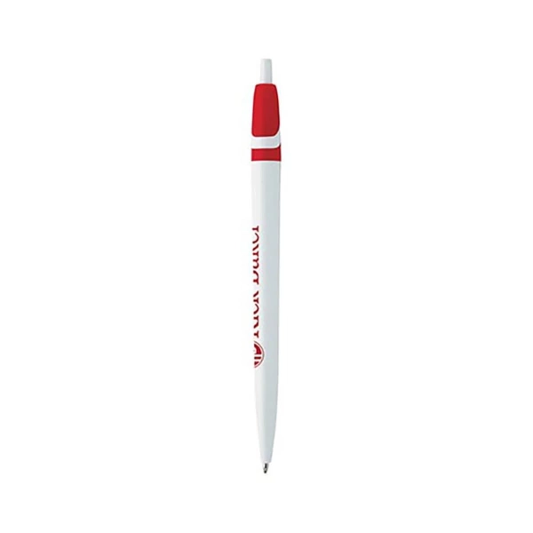 This retractable ballpoint pen pairs a crisp white barrel with vibrant colour accents that add a playful touch to its design. It’s a bold canvas for brilliantly vivid branding and comes loaded with black ink.
