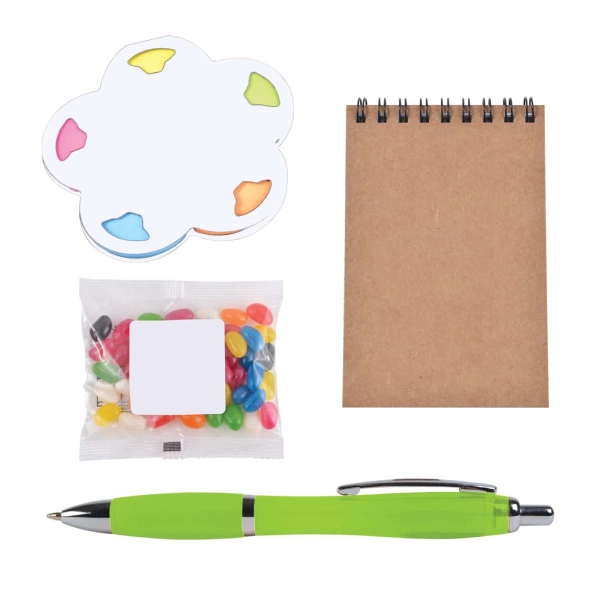 The Encore Office Pack offers a versatile collection of essentials for your workspace. Featuring Daisy Sticky Notes for quick reminders, the Survey Spiral Pocket Notebook for efficient note-taking, the Viva Pen for smooth writing, and a 50-gram bag of colourful jelly beans for a sweet treat. All items come neatly packaged with a digital cardboard header, making it an ideal choice for a productive day at the office.
