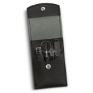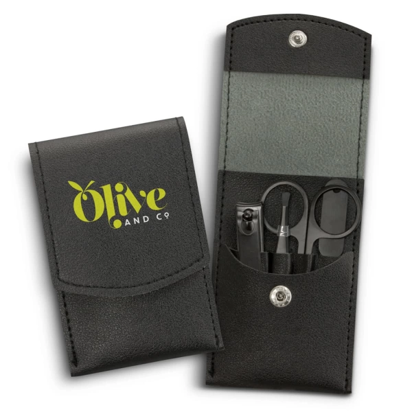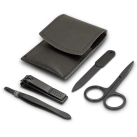 Premium manicure set which includes scissors, nail clippers, a nail file and a set of tweezers in a leather-look PU pouch. Branding is on the pouch which features a dome closure and smart matching stitching.