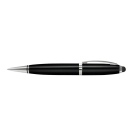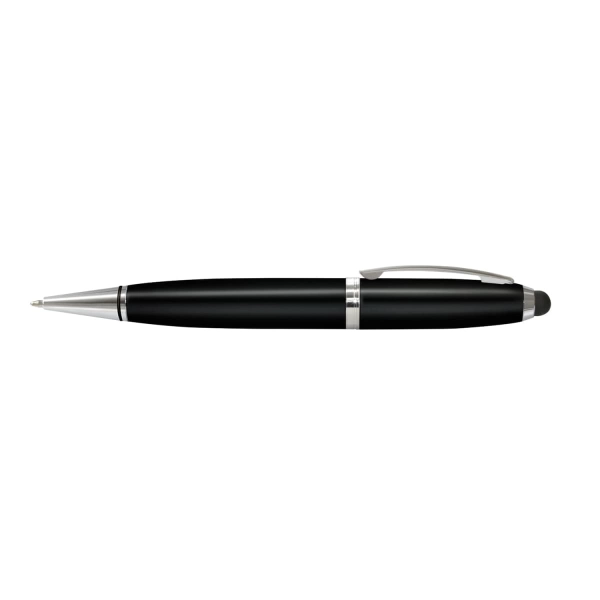 Twist-action brass ballpoint pen with a built-in 4GB flash drive. The pen has 500m of black ink, a stylus for use on touch screens and shiny chrome accents. The flash drive has a USB 2.0 interface, a read speed of 5MB/s and a write speed of 3MB/s, and data uploading is available on request. The pen can be presented in an optional gift box.