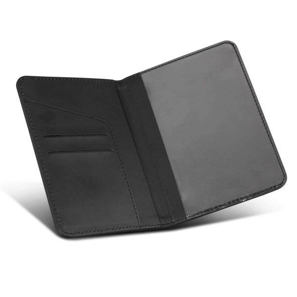 PU passport wallet with 'PASSPORT' debossed on the cover. Designed to protect your passport, the wallet has a clear sleeve to display the photo ID as well as two credit card slots and a sleeve to hold tickets and travel papers.