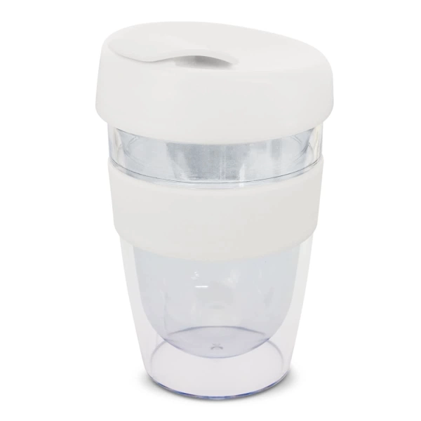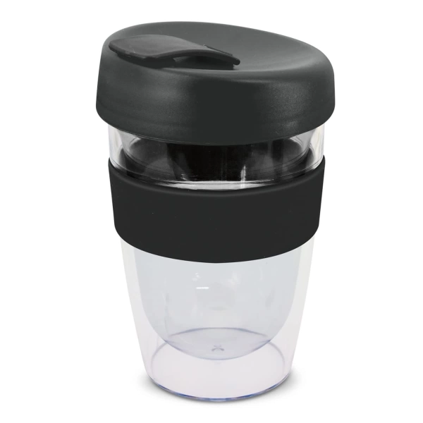 330ml double wall reusable coffee cup which will keep drinks hot for longer. It has a silicone band and a secure screw on lid with a splashproof flip closure. The cup is manufactured from crystal-clear AS plastic and the lid is polypropylene. Both materials are BPA-free. The lid, flip closure and band can be mixed and matched in any colour combination from the standard colours at no extra cost. Up to five different colour combinations are included in the price and more are available for an additional charge. An optional natural gift box is available on request. This product is not dishwasher safe and handwashing is recommended. Express Cup Leviosa is protected under New Zealand Design Registration No. 419451 and Australian Design Registration No. 361937.