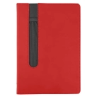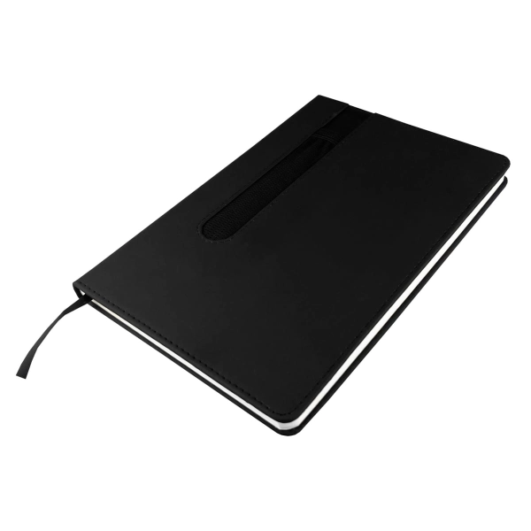 A5 soft-touch PU leather notebook with built-in black pen sleeve on the front cover. 80 lined off-white pages with black elastic closure and matching colour fabric bookmark.