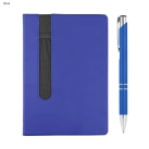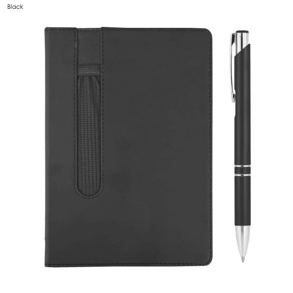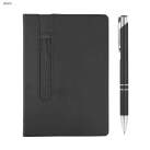 This A5 soft touch PU leather notebook features a built-in black pen sleeve, 80 lined off white pages, black elastic closure, and a matching fabric bookmark. Paired with a stylish aluminium pen with a Parker Type German refill, both are presented in a durable black cardboard gift box, perfect for gifting.