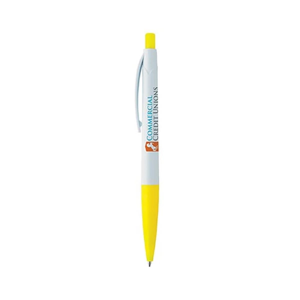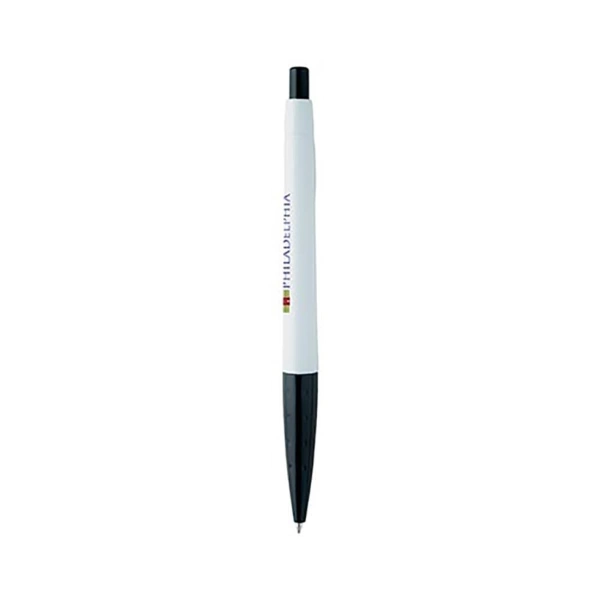 Find a bit of fun in your stationary collection; this pen is a retractable ballpoint with a white barrel and colour accents. Offering clear, clean branding. Comes with black ink.