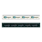 Plastic 30cm ruler with graduations in both centimetres and inches. It has a recessed bottom edge that flips the ruler up when pushed so it is easily picked up from a flat surface.