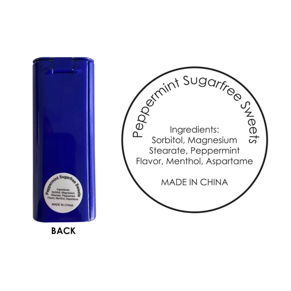 Food grade metal rectangular flip top mint tin filled with sugar free breath freshener mints(approximately 180pcs) and full ingredient and nutritional information is printed on the back of the tin. Sealed with plastic wrapping on the side.