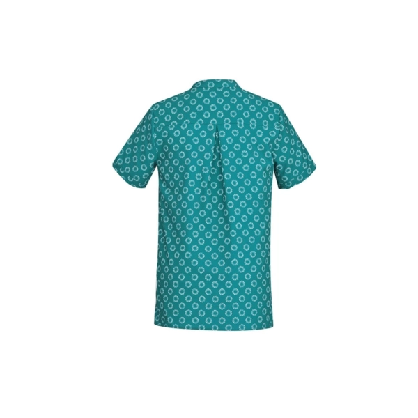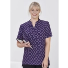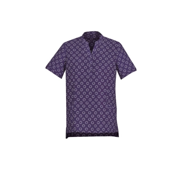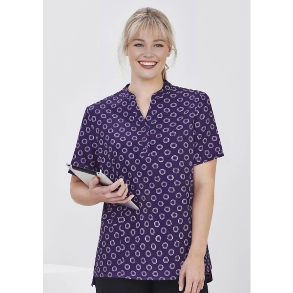 Styles features longer hem lengths, hidden bust button on short sleeve style, side splits and pockets.