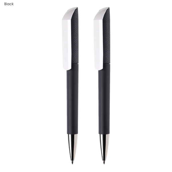 Crafted in Italy, the Flow by Maxema is a premium twist action pen made from non toxic, highly durable ABS plastic with a chrome finished tip. Its aerodynamic clip stands independent from the cap, allowing bold colour contrasts, while the textured version features a sleek honeycomb cap design. Equipped with a jumbo refill offering up to 2500 metres of black or blue ink, it delivers a smooth writing experience. With a rubber finish barrel, glossy white clip, and matte textured cap, this pen is both stylish and functional. Presented in a sleek black cardboard gift box with foam insert.