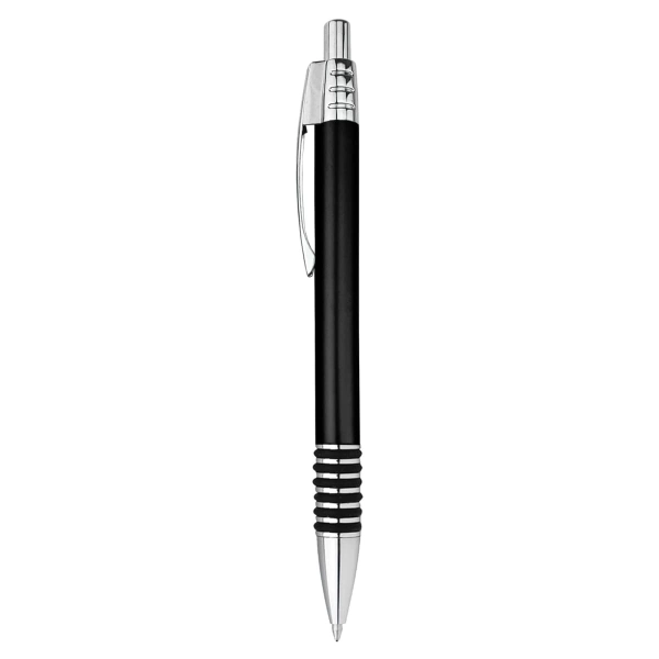 Slim line body with elegant contemporary design Unique 5 rubber ring grip distinct this pen from others. Click action with shiny silver chrome accents metal Parker-Type German manufactured black ink refill 1200 meters writing distance tungsten carbide ball provides you with quality writing. Engraves to a matt silver colour image.