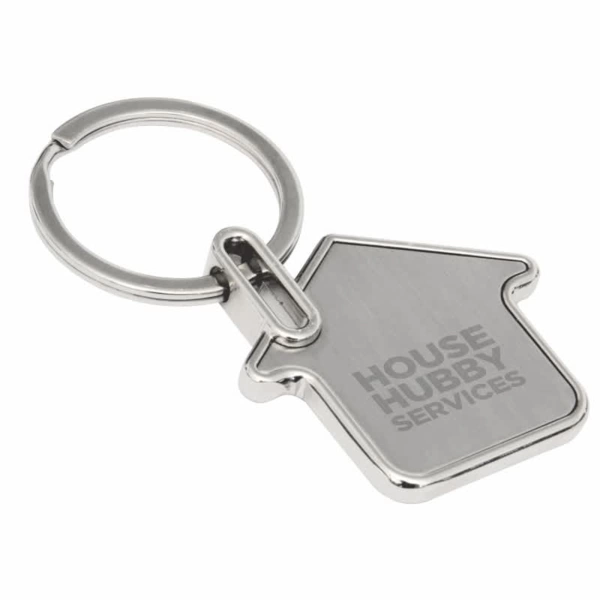 A stylish house-shaped keyring featuring a brushed chrome engraving area with chrome trim.