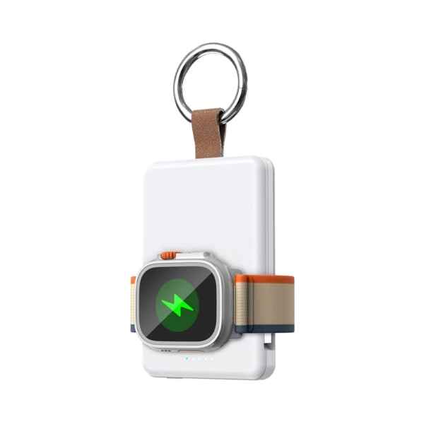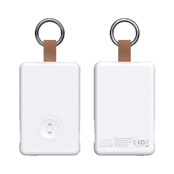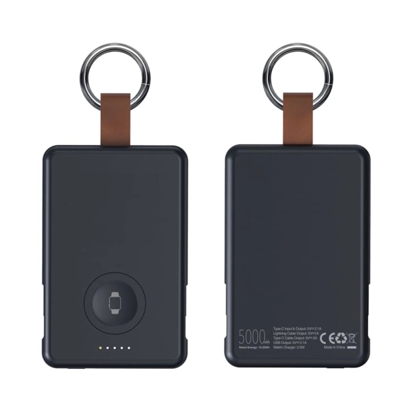 The Franklin is an innovative power bank that supports charging Apple and Samsung smart watches. Its sleek design features a 5,000 mAh magnetic power bank, built-in Type-C and Lightning cables, and Type-C and USB ports, ensuring maximum compatibility with all devices. It includes a convenient built-in key ring with a leather loop, offers built-in protection circuitry, and easily fits in your pocket or bag for secure storage. The Franklin will meet all your charging needs and is the ideal solution for the busy road warrior. The package includes a Type-C charging cable and a user manual. Materials: ABS, PU leather.