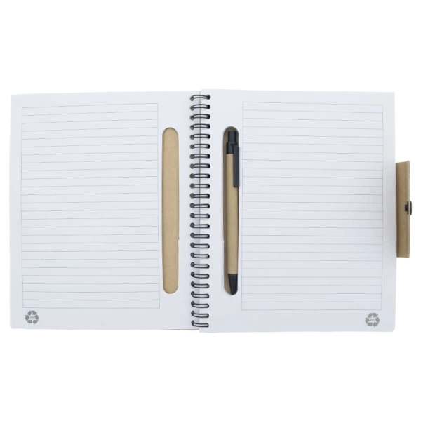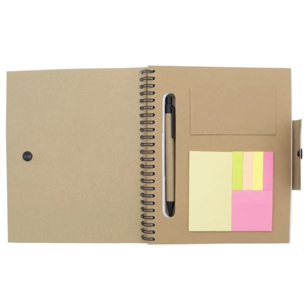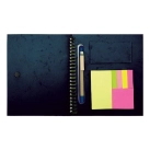 This eco-friendly journal is the ultimate tool for staying organised while making a sustainable choice. With a durable cardboard cover made from recycled paper and a sleek black snap closure, it offers 70 pages of recycled lined paper, printed with soy ink. Featuring the recycled logo on each page and the back cover, it’s a great way to showcase your commitment to the environment. Plus, it includes a recycled blank black pen, large and medium yellow adhesive notes (25 sheets each), and five colours of adhesive note flags to help you highlight what matters most!